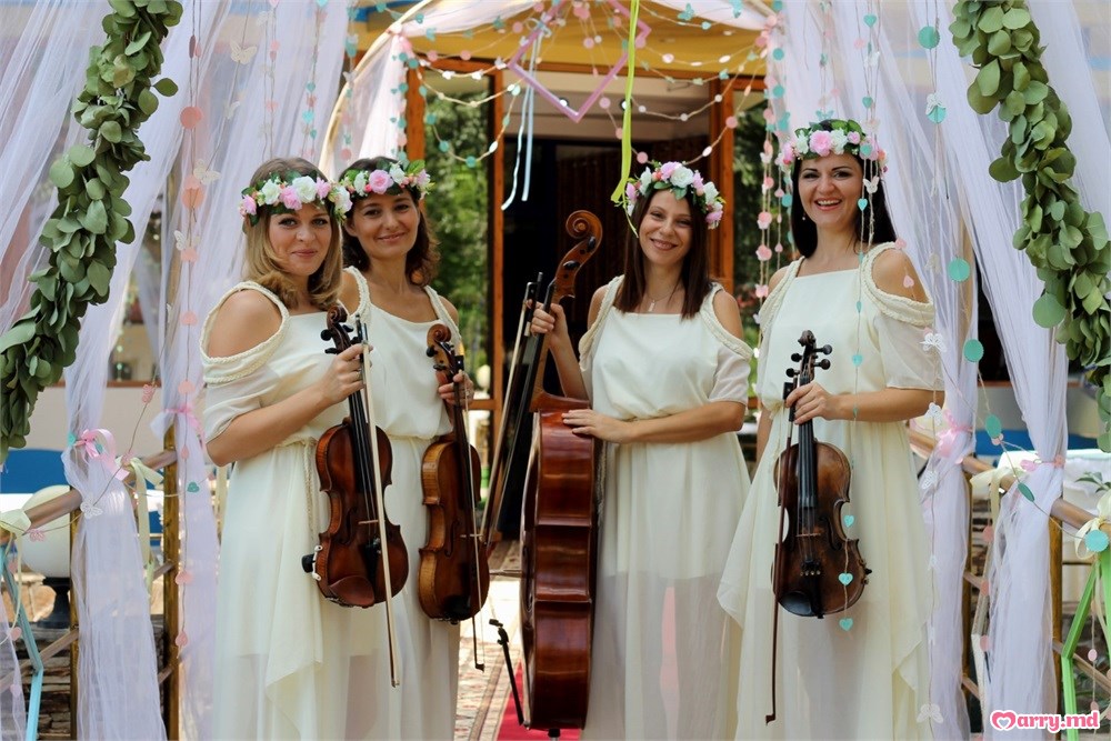 Invitați un quartet de instrumentiști. În timpul înregistrării căsătoriei sau al celui rezervat pentru întâmpinarea oaspeților, muzica instrumentală interpetată live va crea petrecerii o atmosferă de poveste, perfectă pentru începutul unei nunți frumoase.
