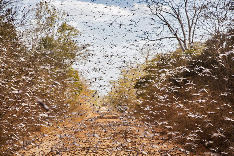 Atacul unui roi de lăcuste în Madagascar. Fotograful a fost împânzit de insecte, însă, după cum spune el, „a meritat un pic de efort pentru o imagine bună”.