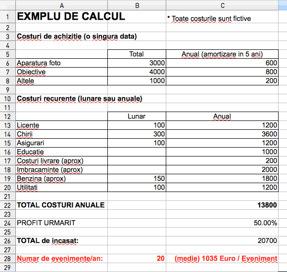 Asadar, din tabelul de mai sus reiese ca ar trebui sa percepi un cost minim, teoretic, de peste 1.000 Euro / eveniment, daca vrei iesi pe plus si sa te incadrez in planul stabilit. Cu un profit minim, dar iarasi zic, este doar un exemplu didactic de calcul. Si fara a tine cont de valoarea experientei anterioare acumulata de fotograf, cursuri etc.