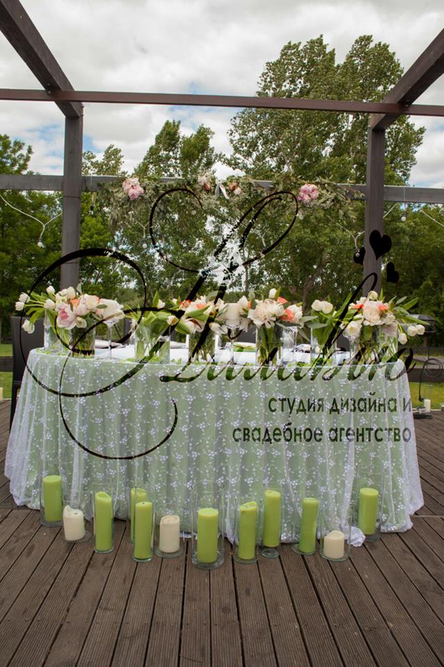 Folosirea unor nuanțe deschise de galbenă-verzuie (măsliniu), decor cu lumânări albe și aranjamente florale din lalele este combinația perfectă pentru o nuntă în aer liber. Pentru decorul zonei de înscriere, puteți opta pentru ghirlande din flori și ramuri în alianță cu textile vaporoase. Cărarea improvizată cu felinare se privește în mod armonios cu iarba verde care oferă un cadru delicat pentru înscrierea oficială. Atmosfera relaxantă și localul au fost invadate cu arome parfumate de bujori, lalele și trandafiri.