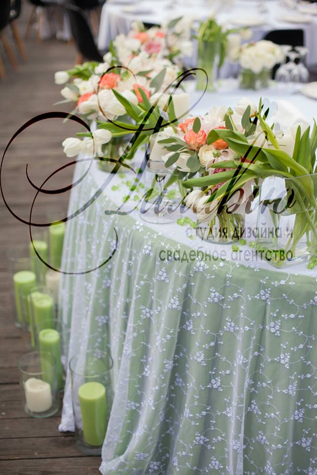 Folosirea unor nuanțe deschise de galbenă-verzuie (măsliniu), decor cu lumânări albe și aranjamente florale din lalele este combinația perfectă pentru o nuntă în aer liber.