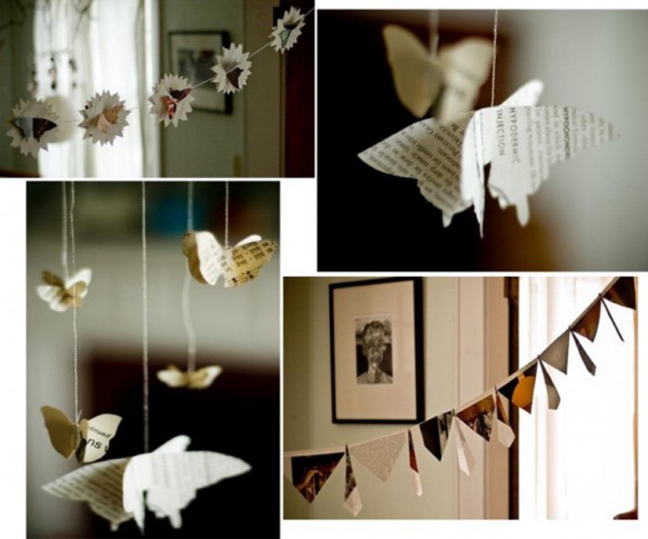 Amintește-ți de orele de educație tehnologică din școală la care cu siguranță ați confecționat diverse flori, fluturi, stegulețe sau fulgi din hârtie. Îndoaie hârtia în două sau trei părți egale și taie-o în formă de fluturași pe care poți să-i suspenzi de tavanul încăperii cu o ață sau o panglică. De asemenea, poți să faci și câțiva metri de ghirlande, floricele, inimioare sau chiar păsări.