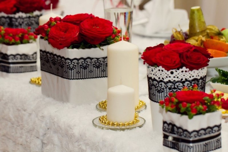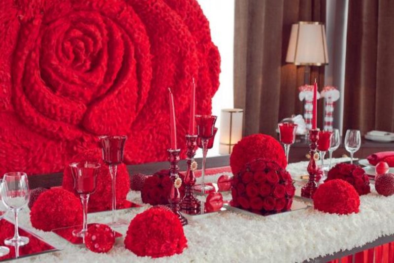 Decorațiunile de nuntă, realizate din flori roșii, o să creeze un anturaj luxos și bogat oricărei încăperi, deoarece roșul e o culoare foarte saturată și atrage insistent privirile. Acesta este un avantaj evident, în cazul în care sala unde veți petrece este una mai modestă. Ar fi bine ca aceasta să fie bine iluminată, și culorile în care este realizat design-ul interior să fie deschise, în caz contrar, este mare riscul de a se creea o atmosferă sumbră în încăperea de sărbătoare.