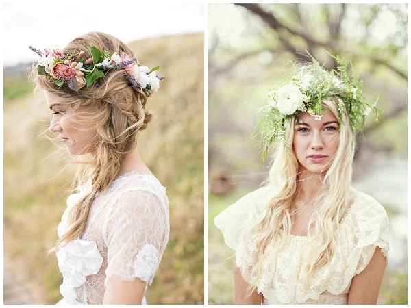 Coafuri boho pentru mirese romantice. Coronița din flori naturale și părul lejer sunt o caracteristică importantă a miresei boeme.
