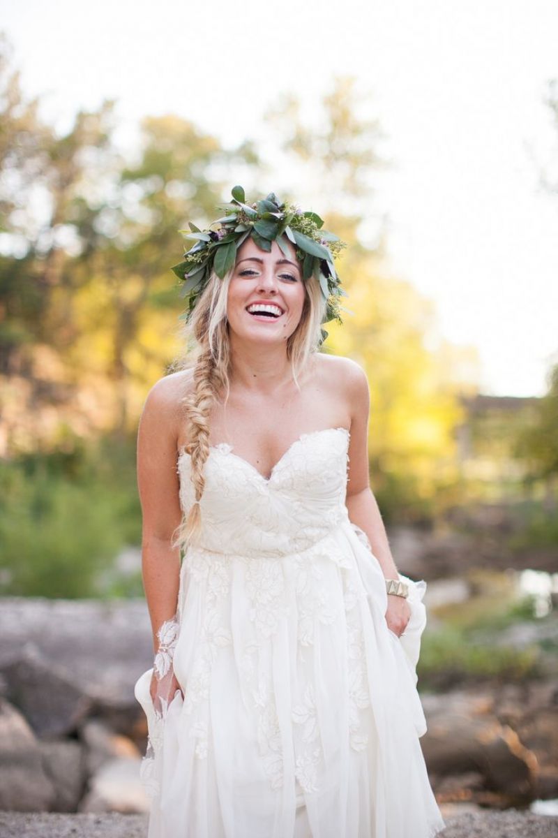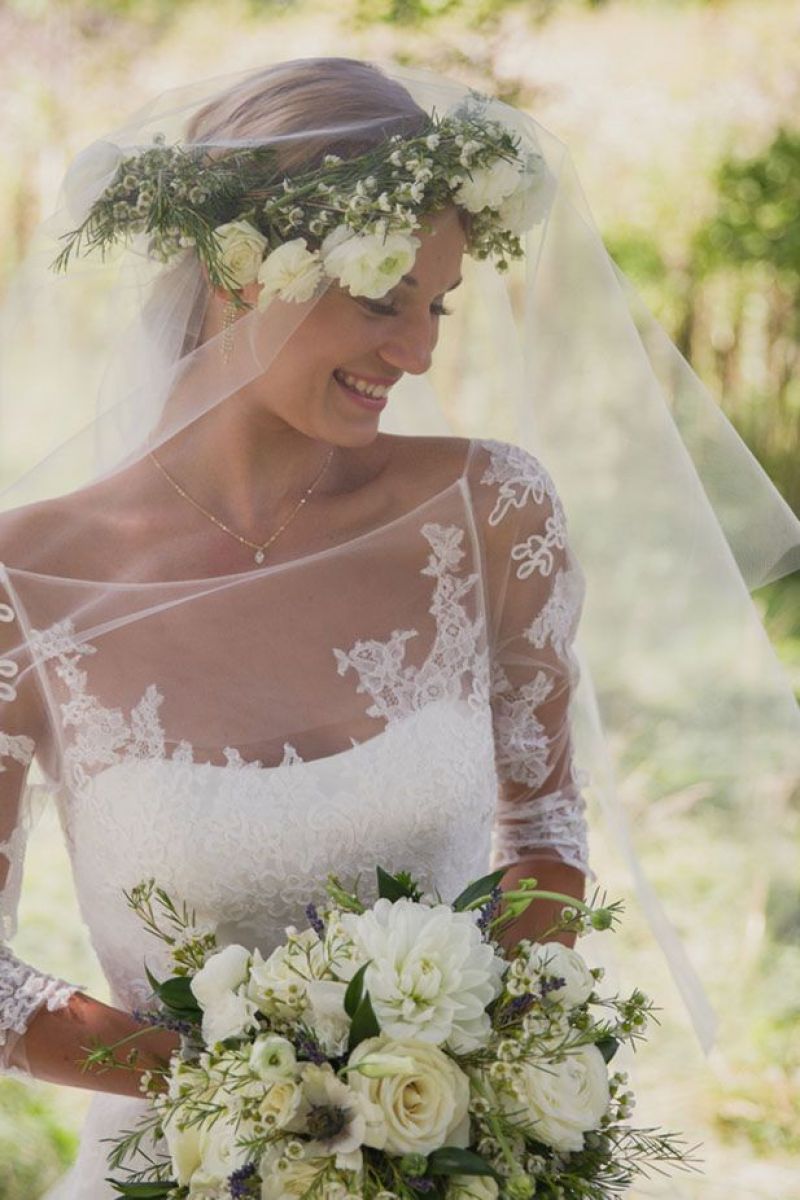 O nuntă de vară boho nu ar fi perfectă fără coronița de flori și bucle lejere. Această coafură este ideală pentru miresele care poartă rochii cu mâneci lungi.