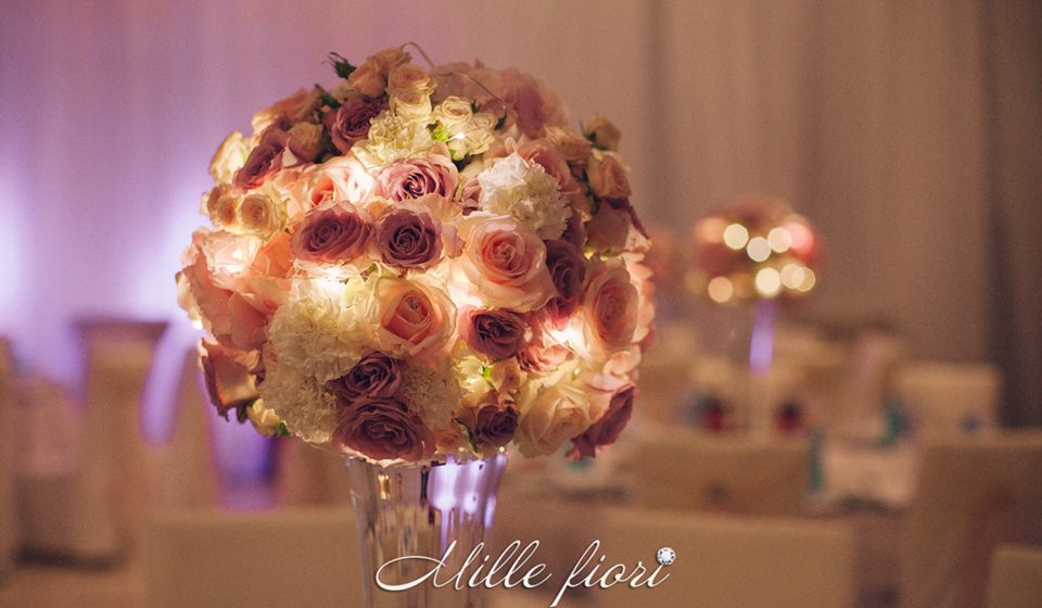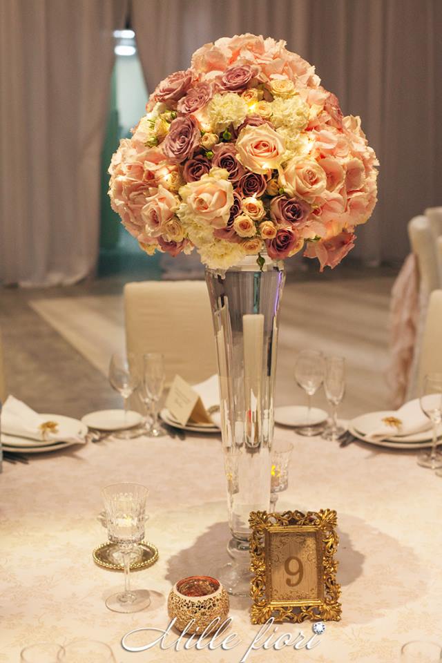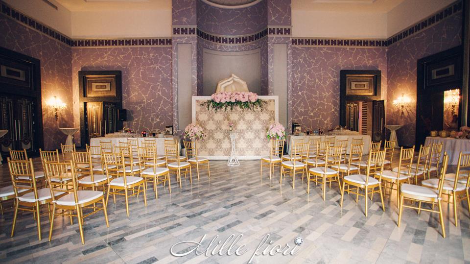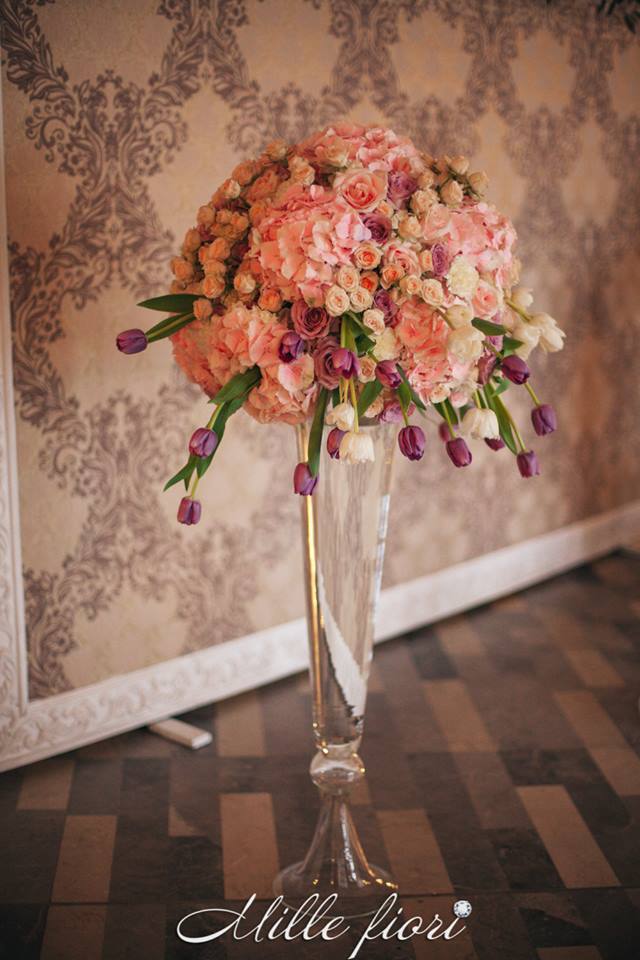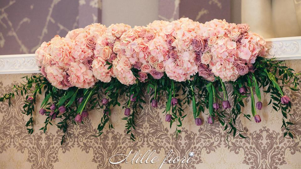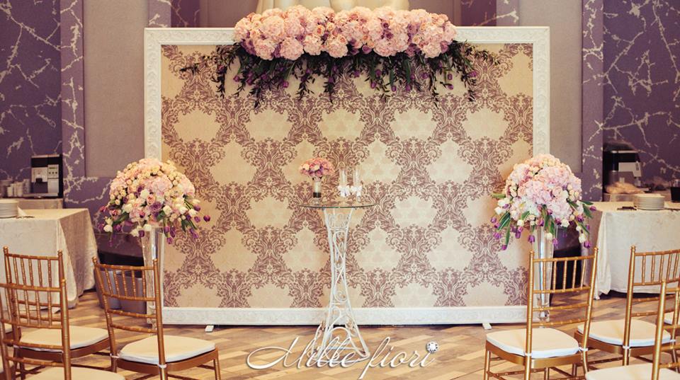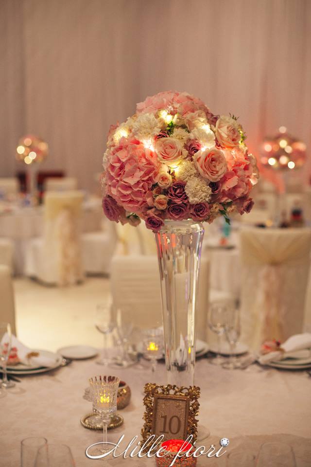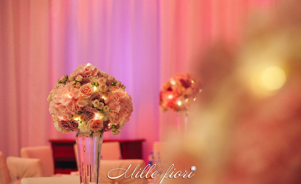 Decorațiunile din flori vii oferă gust și aromă oricărei sărbători. Decorul creat de Mille Fiori, pe lângă atmosfera somptuoasă, oferă statut regal oricărui eveniment. Cuplul Andrei și Cristina au optat pentru o combinație originală dintre culorile roz-pudră, auriu și mov. Decoratorii au redat delicatețe și gingășie prin fiece detaliu, astfel încât toate elementele în ansamblu să se combine armonios cu interiorul sălii dar și cu starea de spirit a mirilor.