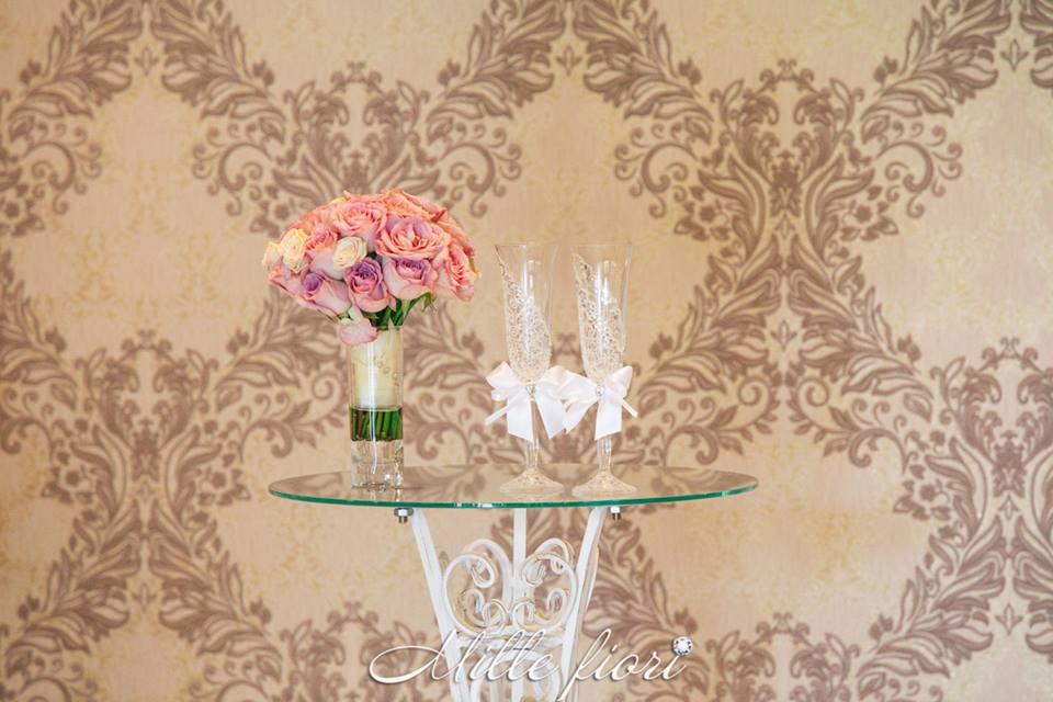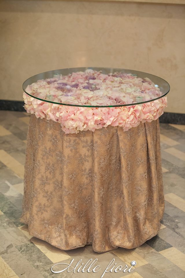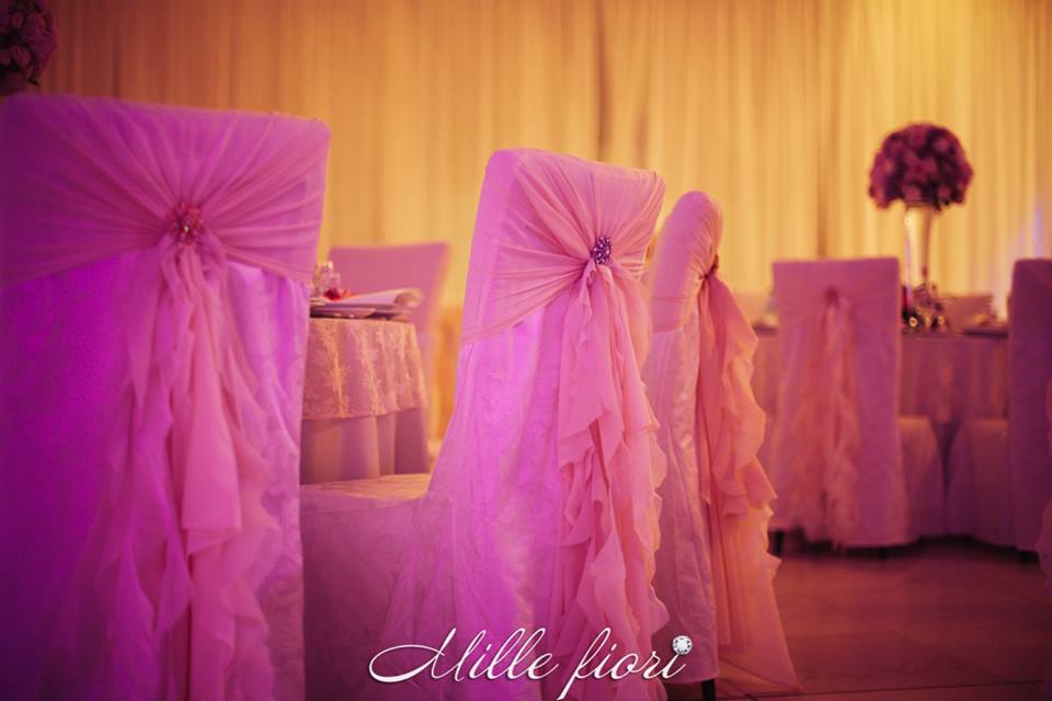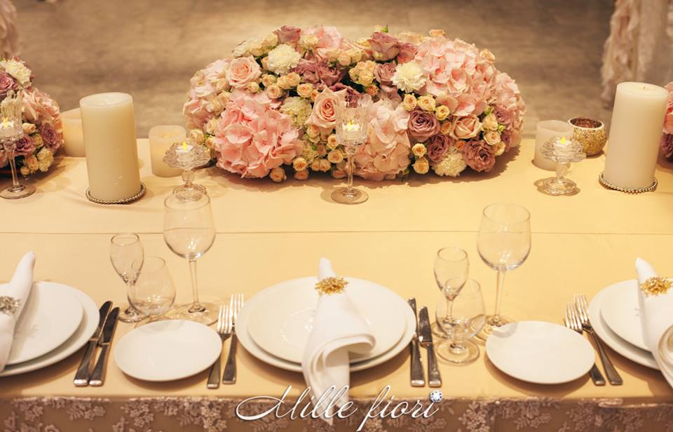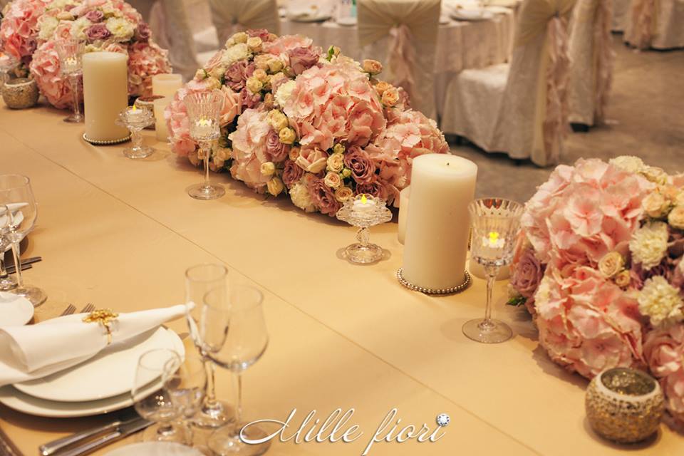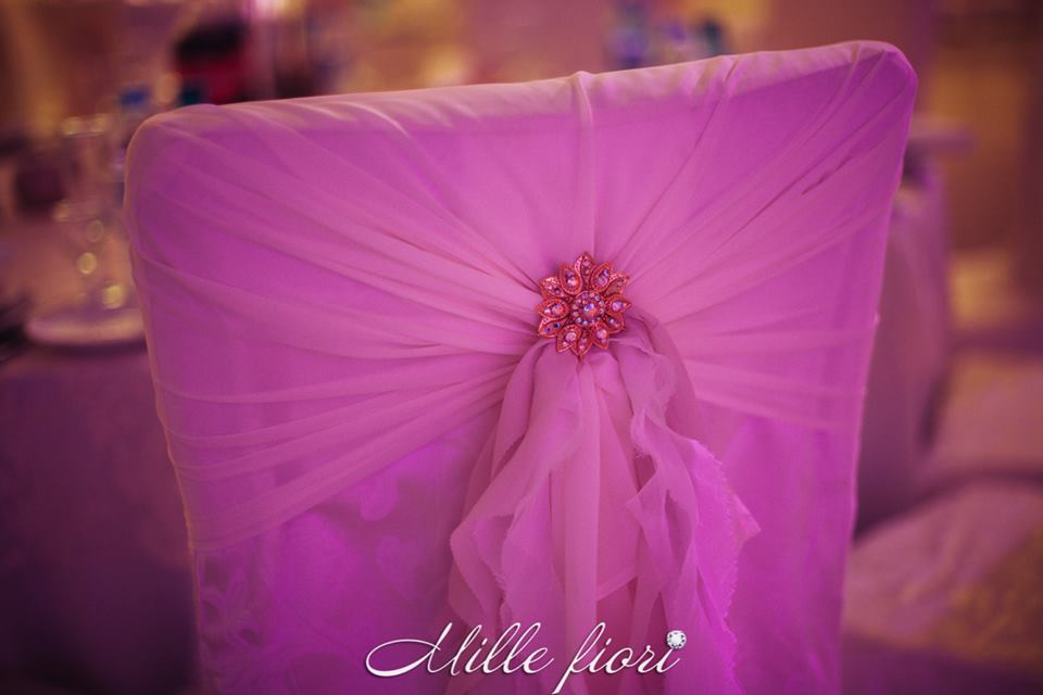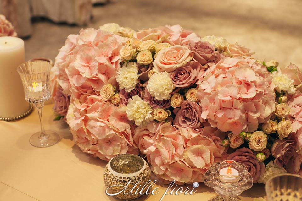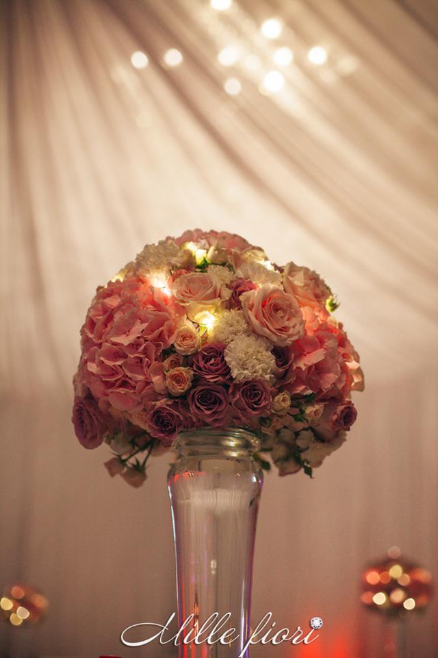 Decorațiunile din flori vii oferă gust și aromă oricărei sărbători. Decorul creat de Mille Fiori, pe lângă atmosfera somptuoasă, oferă statut regal oricărui eveniment. Cuplul Andrei și Cristina au optat pentru o combinație originală dintre culorile roz-pudră, auriu și mov. Decoratorii au redat delicatețe și gingășie prin fiece detaliu, astfel încât toate elementele în ansamblu să se combine armonios cu interiorul sălii dar și cu starea de spirit a mirilor.