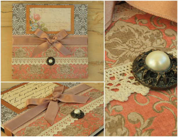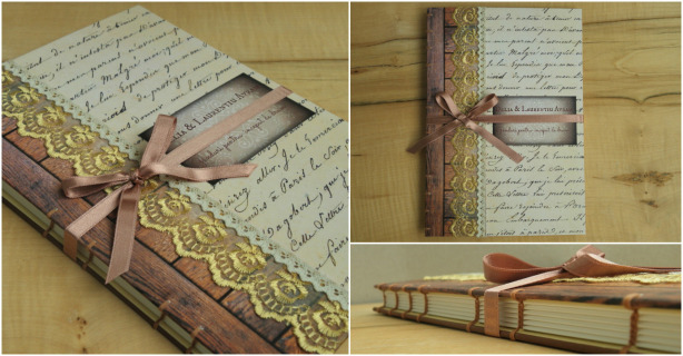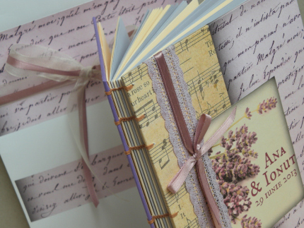 O carte de oaspeți de suflet în stil vintage-handmade cu detalii de levănțica ar oferi un strop de culoare și miros nunții: Cărțile handmade cu inițialele mirilor încrustate pe ea și cu mesajul “Gînduri frumoase pentru un nou început împreună”.Sursa foto: www.auroraboreala.wordpress.com
