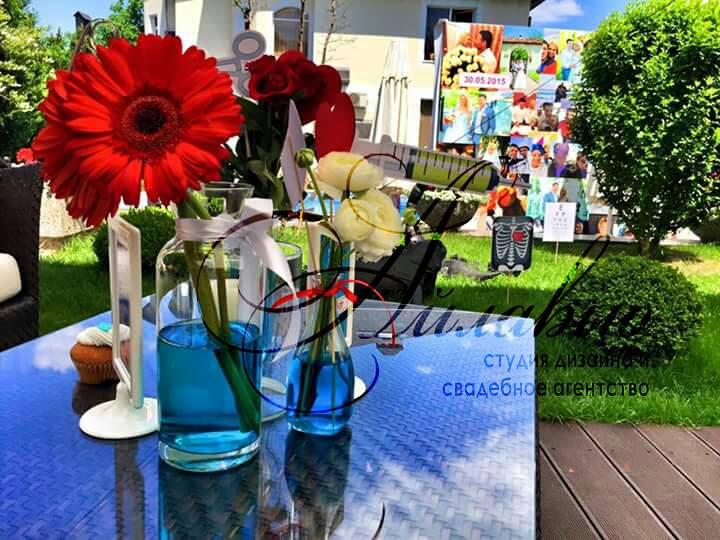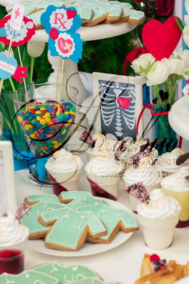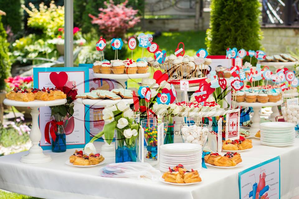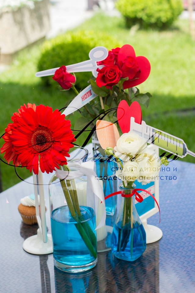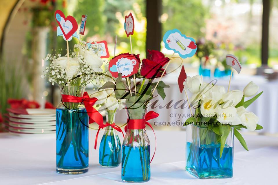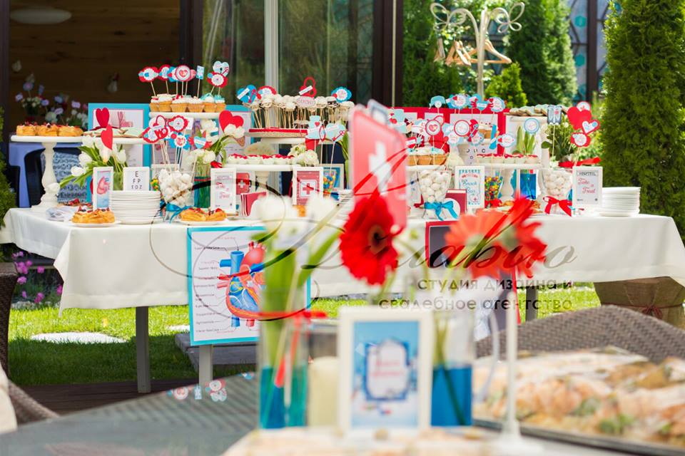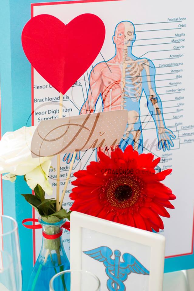 Vă gândiți ce culori să alegeți pentru așa eveniment? Am decis să optăm pentru decor un design floral în nuanțe de albastru și roșu. Un rol important a jucat și imprimeurile și decorul cu tot felul de scheme și inscripții medicale.
