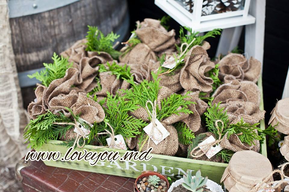 Invitațiile ar trebui realizate din hârtie specială (kraft) sau din carton pentru design. Compozițiile centrale pot fi aranjate pe cărți, secțiuni din lemn, cutii sau pânză groasă de sac. Țesăturile florale și plantele sălbatice vor crea o atmosferă feerică, deosebită.