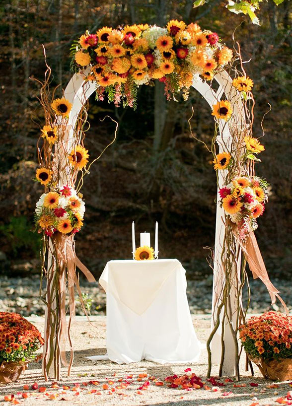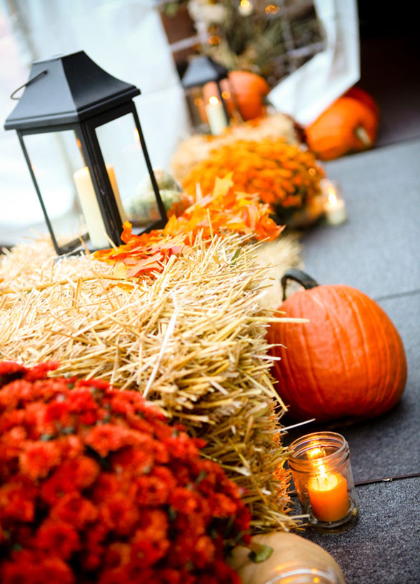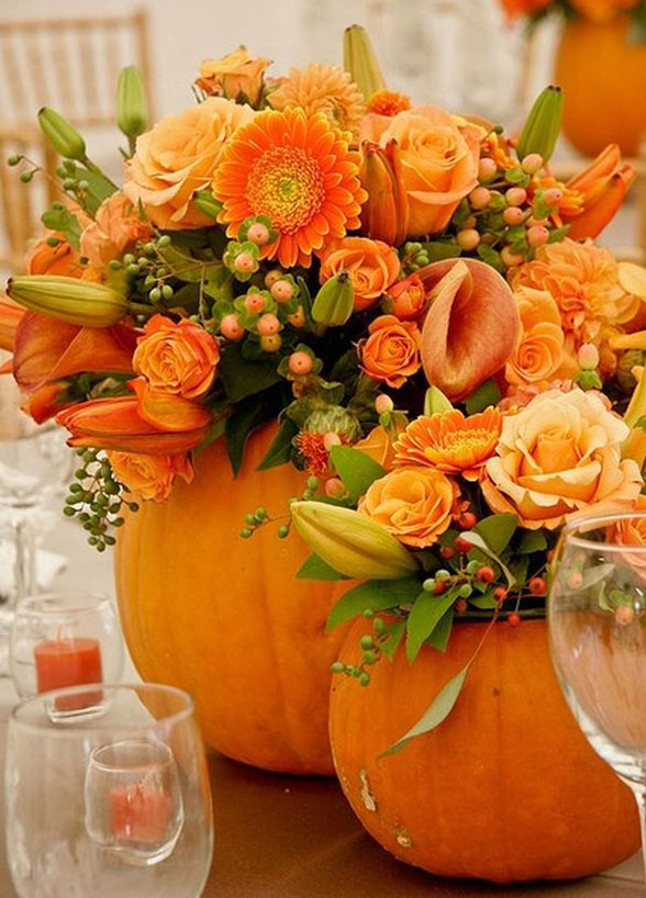 Culorile de toamnă arămii pot constitui o inspirație pentru nunțile organizate în această perioadă. Multitudinea de nuanțe și cromatica specifică acestui anotimp oferă o notă jucăușă și o coloristică pozitivă evenimentului. Nu ai cum să nu te îndrăgostești de acest decor portocaliu. Acest sentiment este întărit de rafinamentul detaliilor și de întregul stil de nuntă din această frumoasă perioadă a anului. Putem combina culorile clasice cu cele care vor da un strop de culoare decorului. Important e să nu vă fie teamă să experimentați și să explorați seria de idei minunate ce pot fi aplicate pentru această ocazie specială. De asemenea, nu uitați că notele de originalitate sunt cele care vor face din nunta voastră un adevărat eveniment pentru voi și pentru invitați. Un alt simbol al nunților tomnatice este și dovleacul. Prin culoarea lor portocalie, sunt ușor de remarcat și se încadrează perfect în decor. Pe lângă dovleac vă recomandăm și aranjamentele din fructe de sezon, pentru aspectul lor bogat: strugurii, merele, castanele, nucile, gutuile.