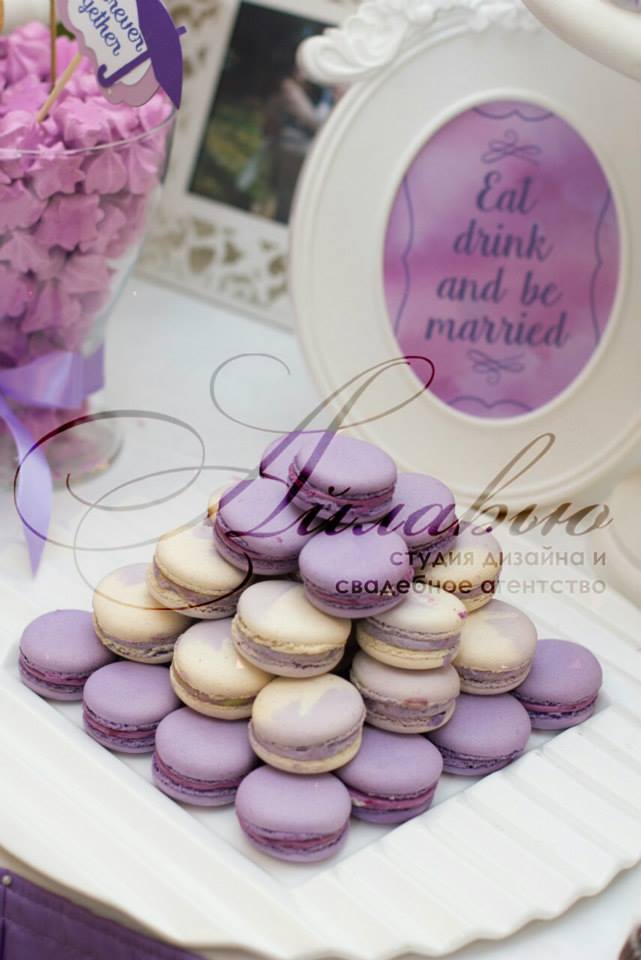 Candy bar în nuanțe violete poate deveni punctul forte și eroul principal în decorul pentru nuntă. Încercați checurile și cup-cake-urile în diferite tonuri ale culorii violet. Masa poate fi asortată cu flori și veselă. De asemenea, nu uitați și de poligrafie specială.