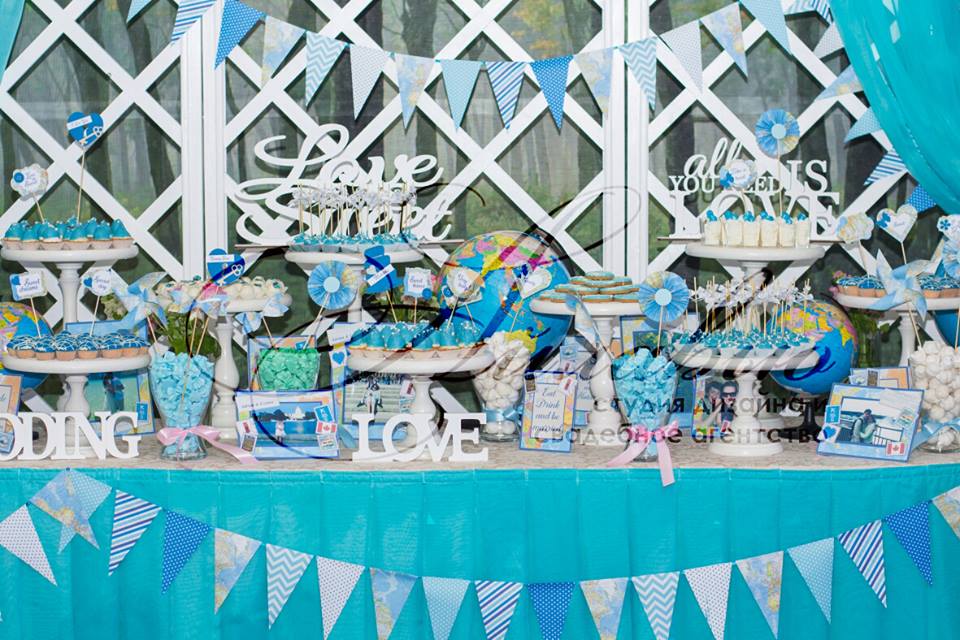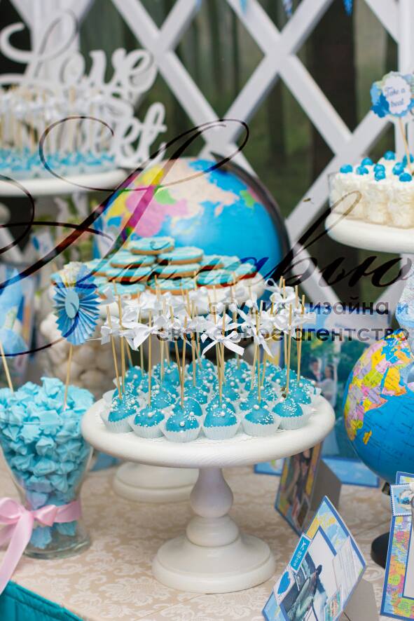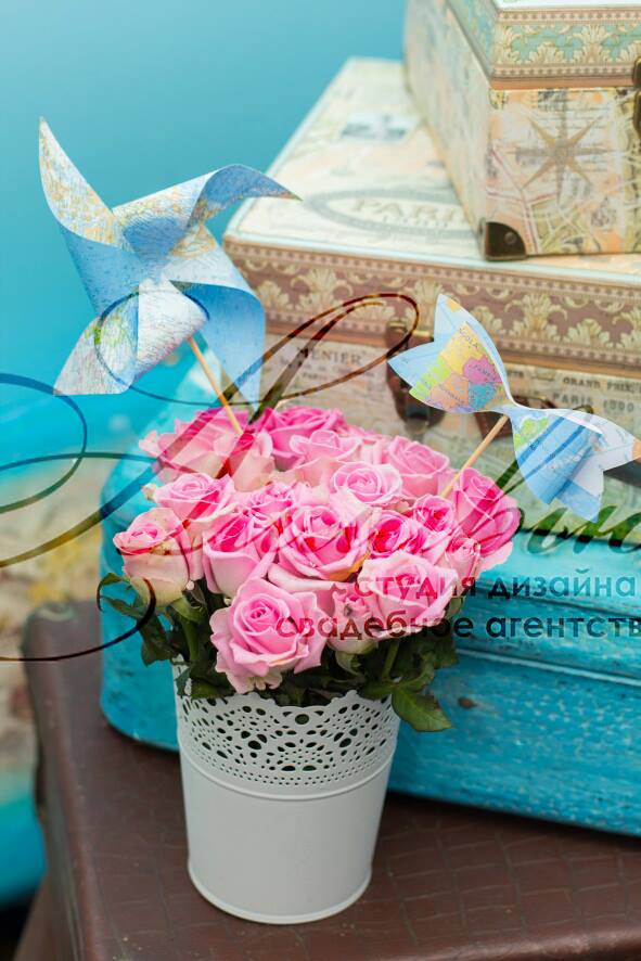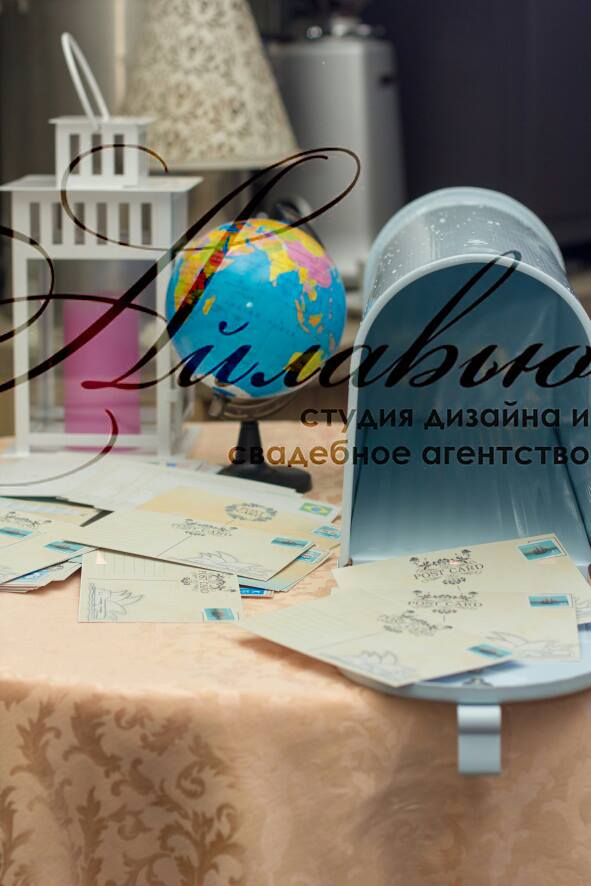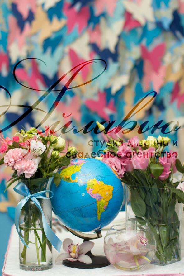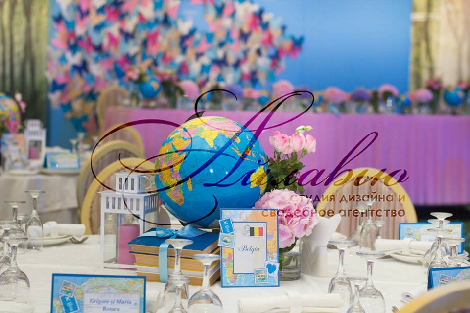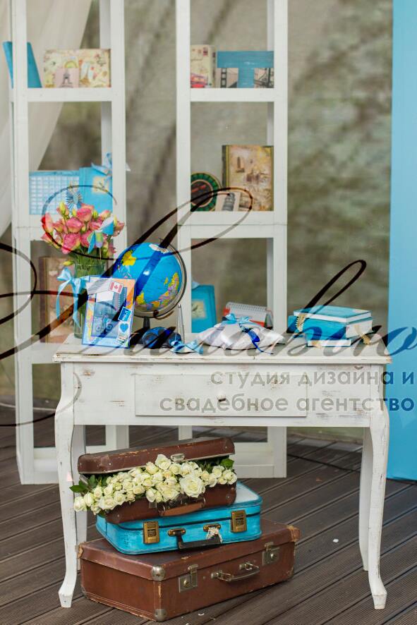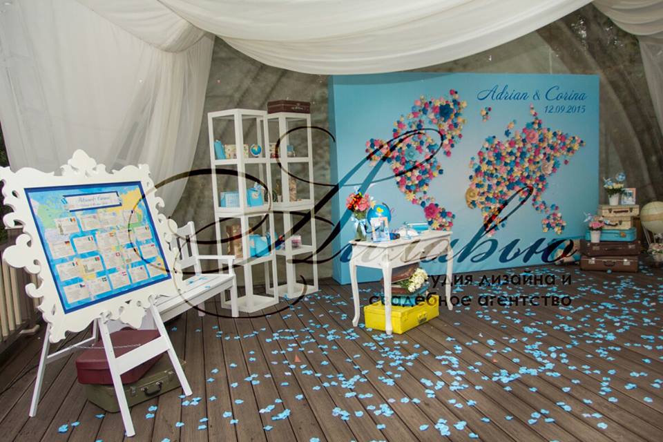 Spațiu pentru organizarea ceremoniei este vast - sunt incluse o mulțime de elemente legate de călătorii, deplasări: hărți, ghiduri de călătorii, atlase, globuri, bilete, avioane, valize.