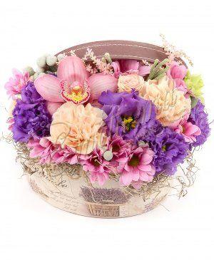 Minirozele și crizantemele reprezintă gingășia și emoția prinnuanțele roz fin, garoafele crem poartă distincția, admirația și recunoștința,lisianthusul mov amintește de înțelepciune și fascinație. Oferă un aranjamentfloral exotic pentru o persoana apreciată sau folosește-l pentru a crea o ambianțăplăcută.