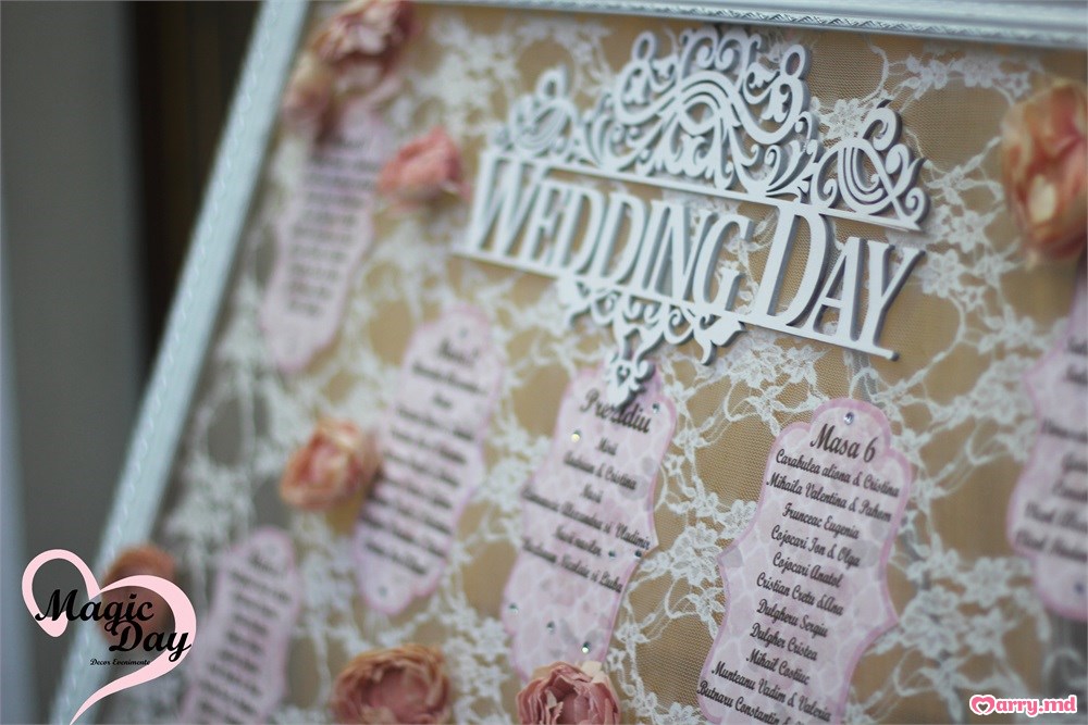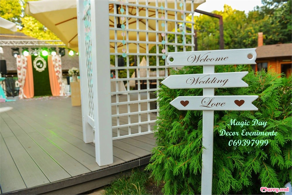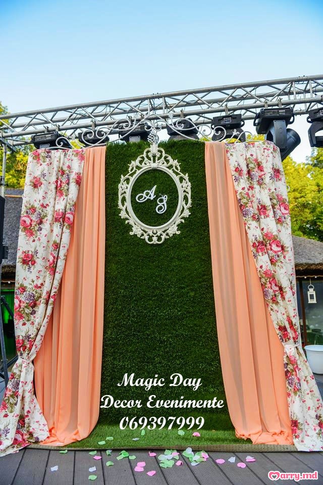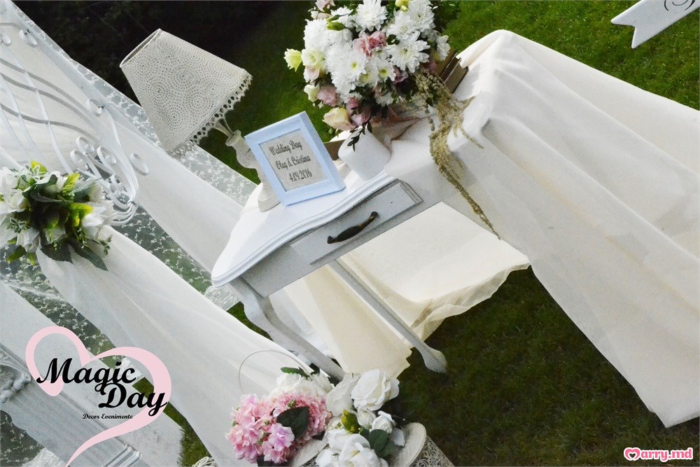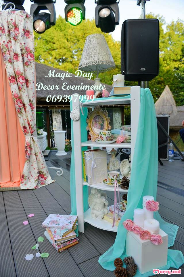 "Magic Day" se ocupă în exclusivitate de decorarea evenimentelor importante din viața dvs. Nunta este asemeni unui spectacol, în care personajele principale sunteți dvs., de aceea optează pentru o comandă unică doar la noi, pentru că, de fiecare dată, depunem dragoste, imaginație, bunăvoință și multă seriozitate pentru a creea cea mai magică zi din viața dvs. Va vom ajuta cu drag cu informatii despre toate serviciile noastre precum si tot felul de sfaturi utile pentru o nunta de vis.