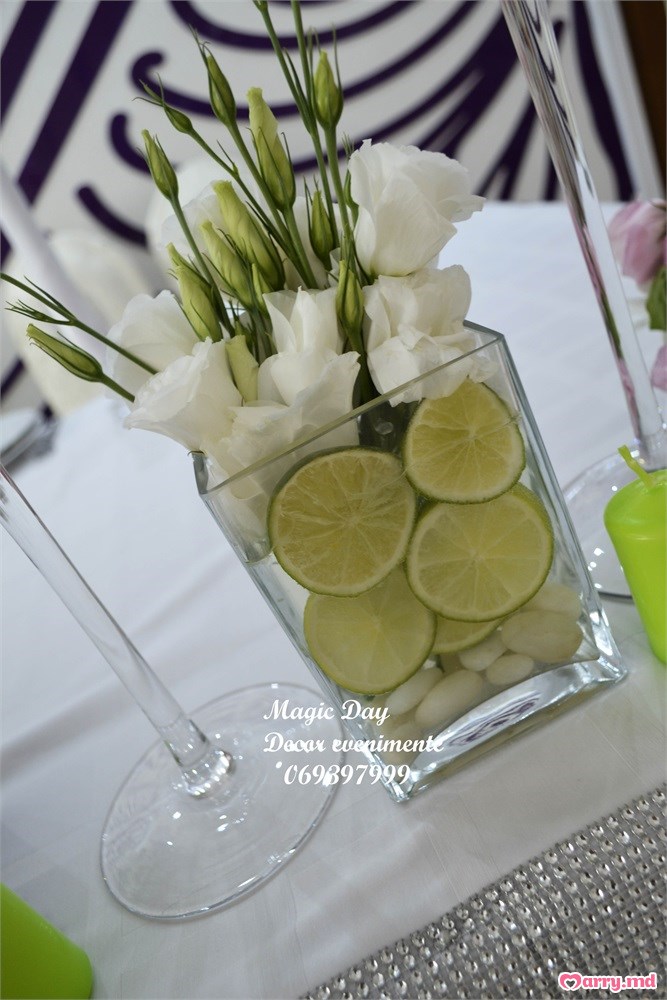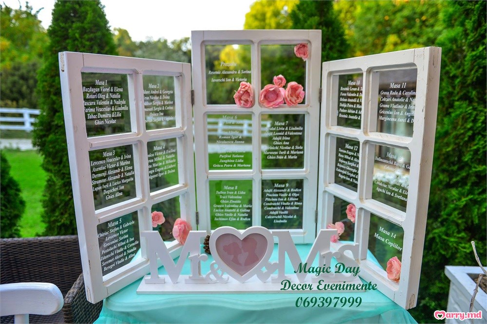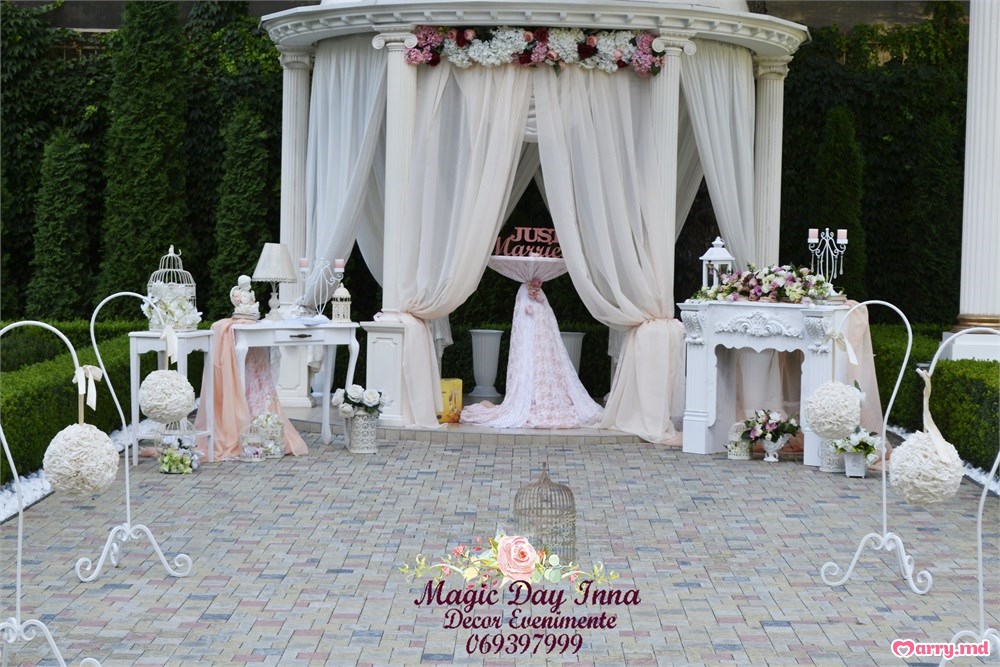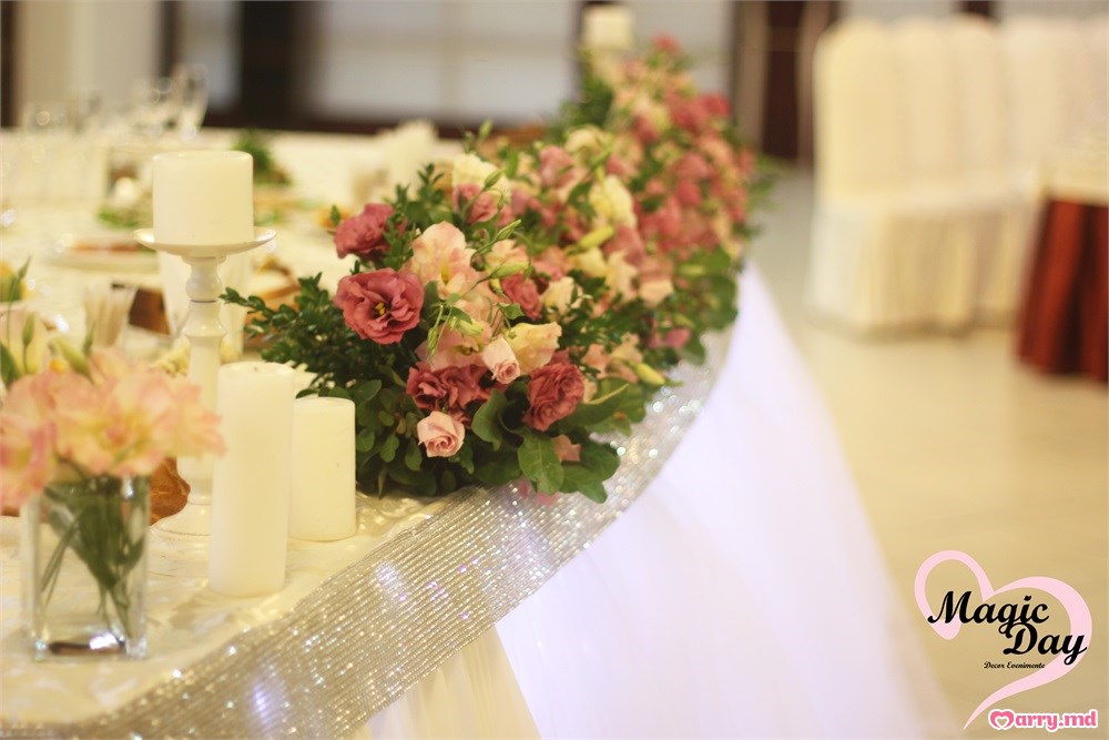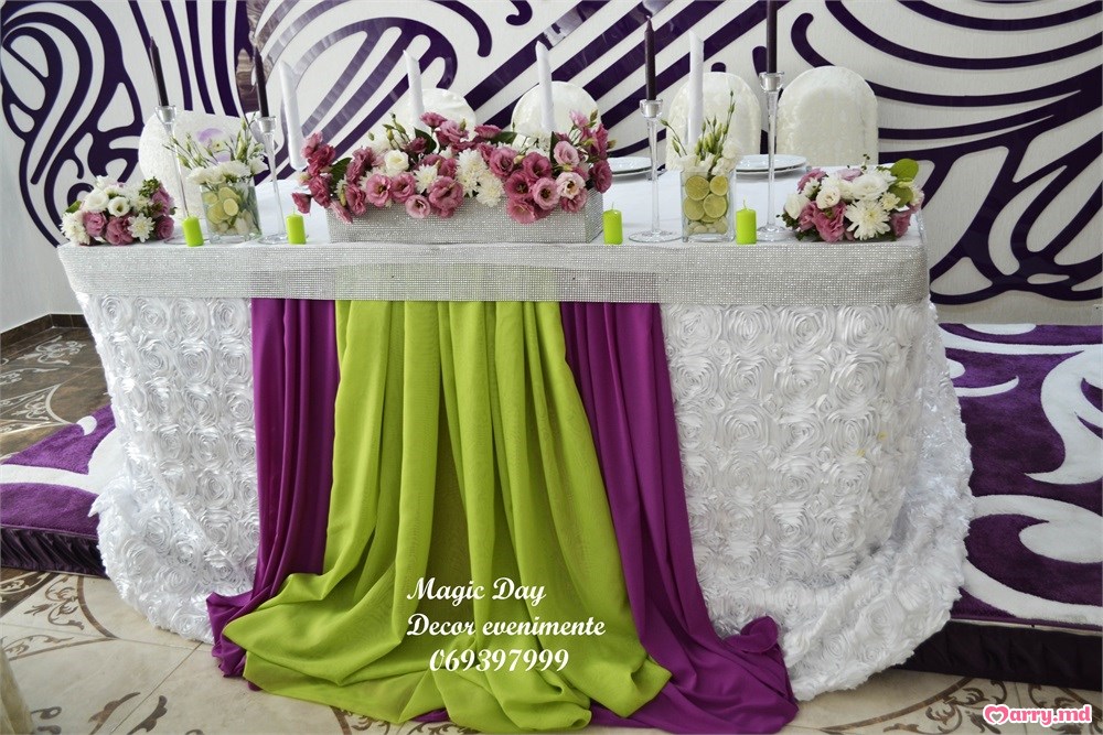"Magic Day" se ocupă în exclusivitate de decorarea evenimentelor importante din viața dvs. Nunta este asemeni unui spectacol, în care personajele principale sunteți dvs., de aceea optează pentru o comandă unică doar la noi, pentru că, de fiecare dată, depunem dragoste, imaginație, bunăvoință și multă seriozitate pentru a creea cea mai magică zi din viața dvs. Va vom ajuta cu drag cu informatii despre toate serviciile noastre precum si tot felul de sfaturi utile pentru o nunta de vis.