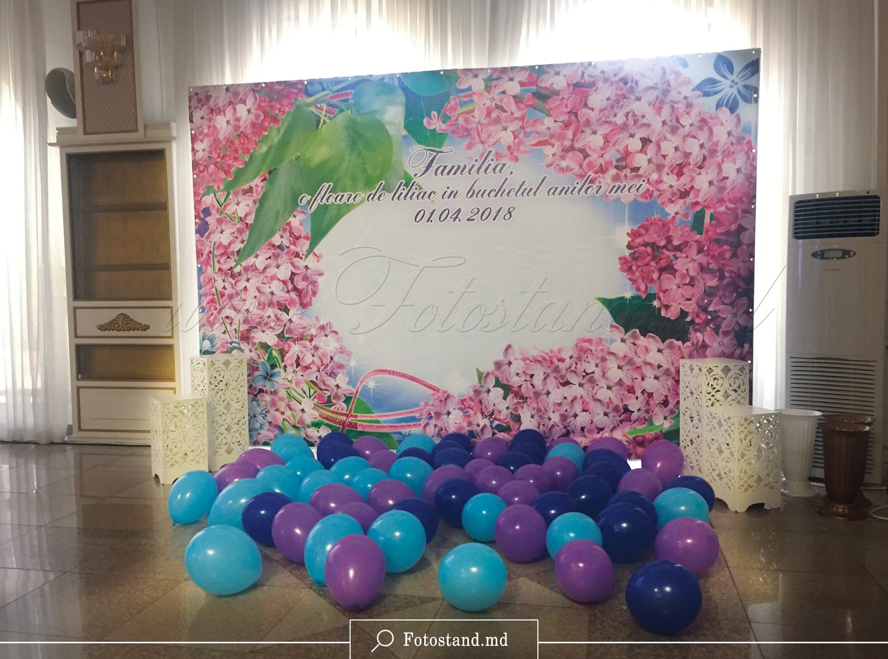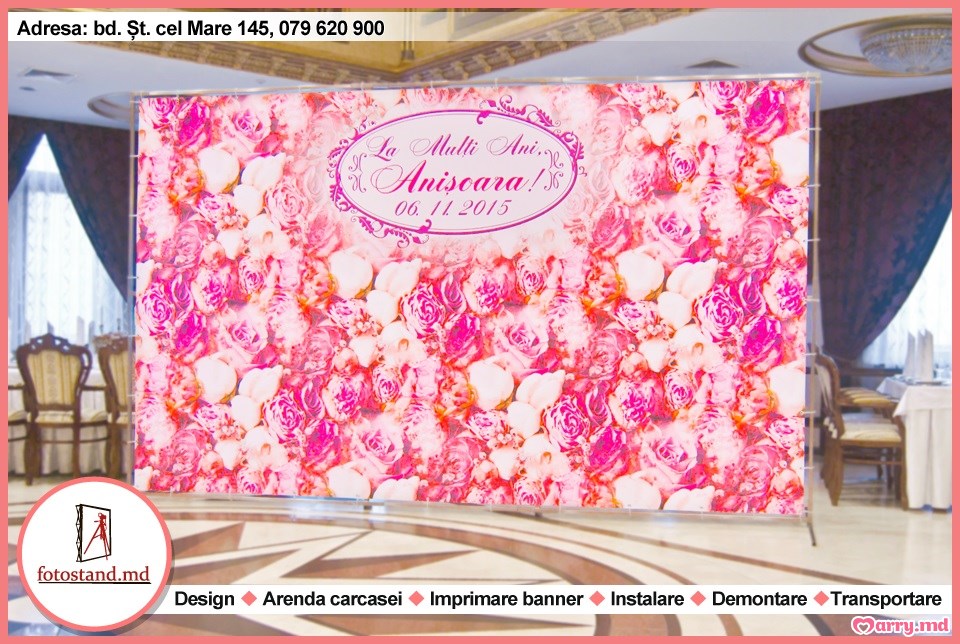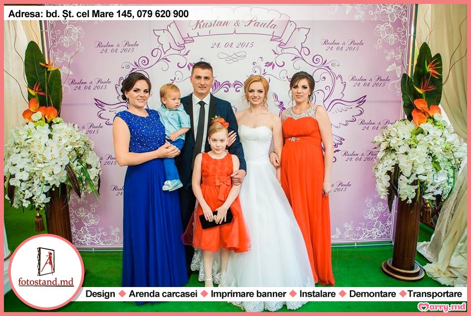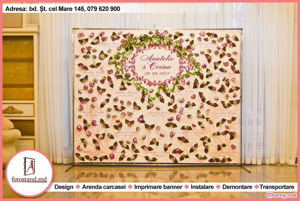Noi prelucrăm designul, imprimăm bannerul, livrăm și instalăm fotostandul în timpul stabilit, la data planificată a nunții și la finisarea acesteia, apoi demontăm standul.
