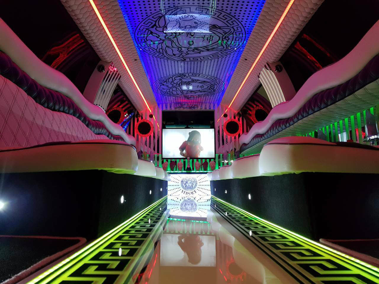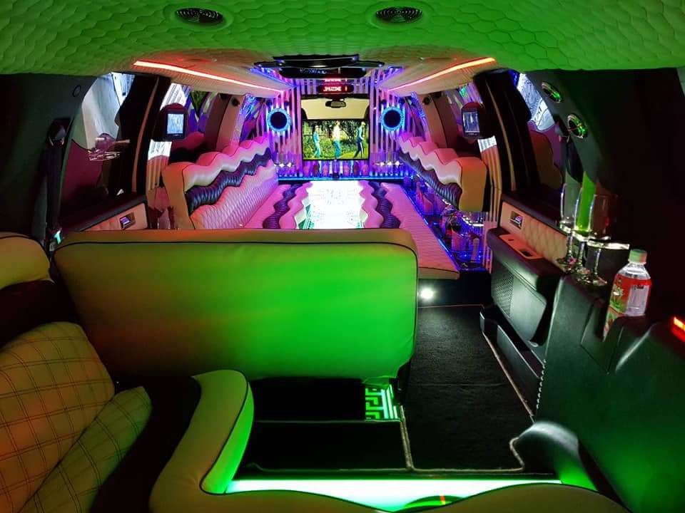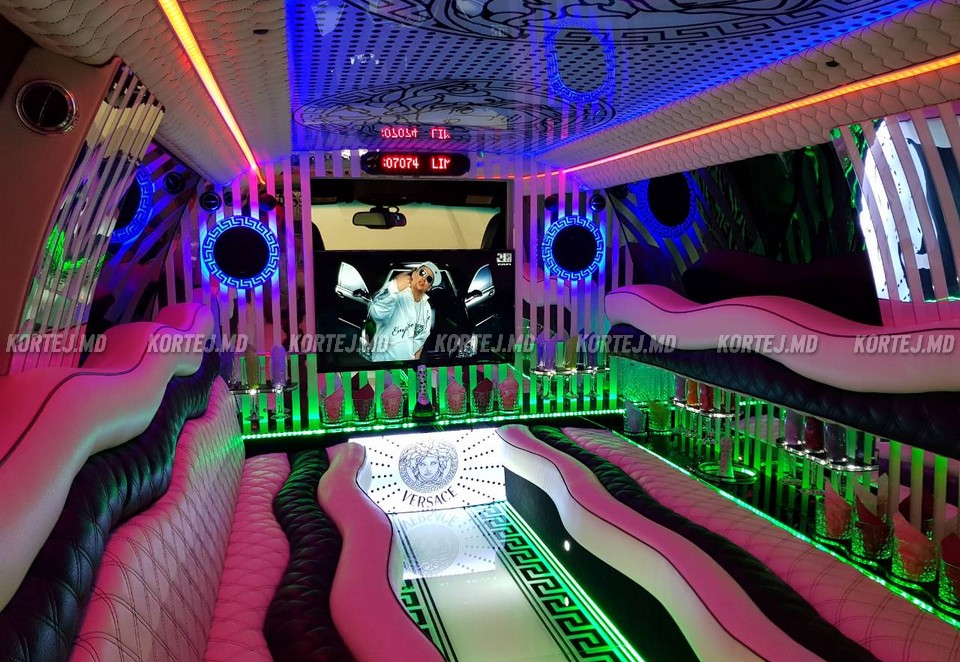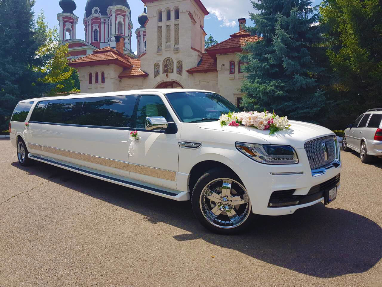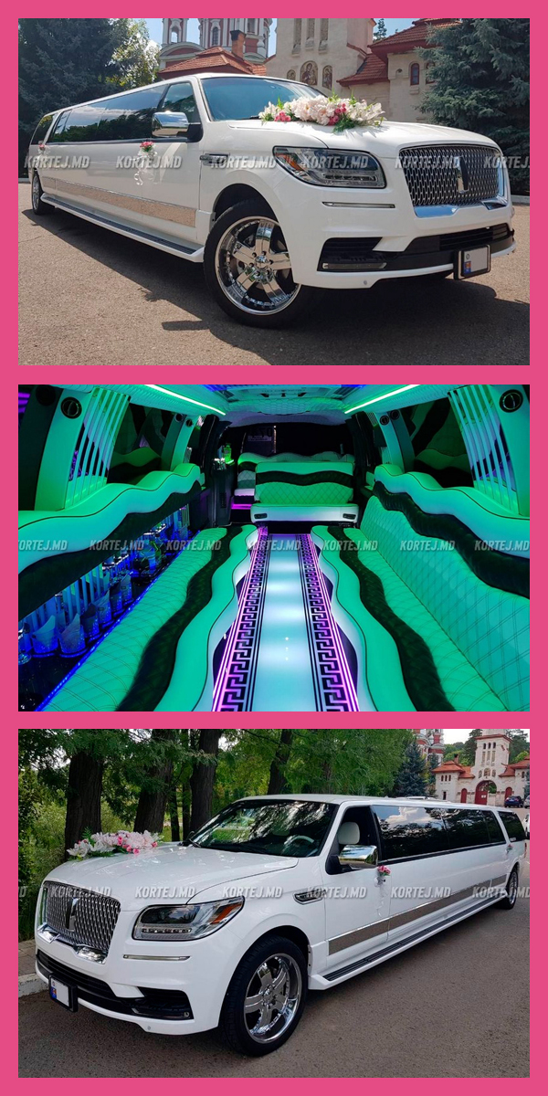 Chiria limuzinei Lincoln Navigator de culoare albă, cabina spațioasă pentru 20 de locuri, TV LCD, iluminat spectaculos.