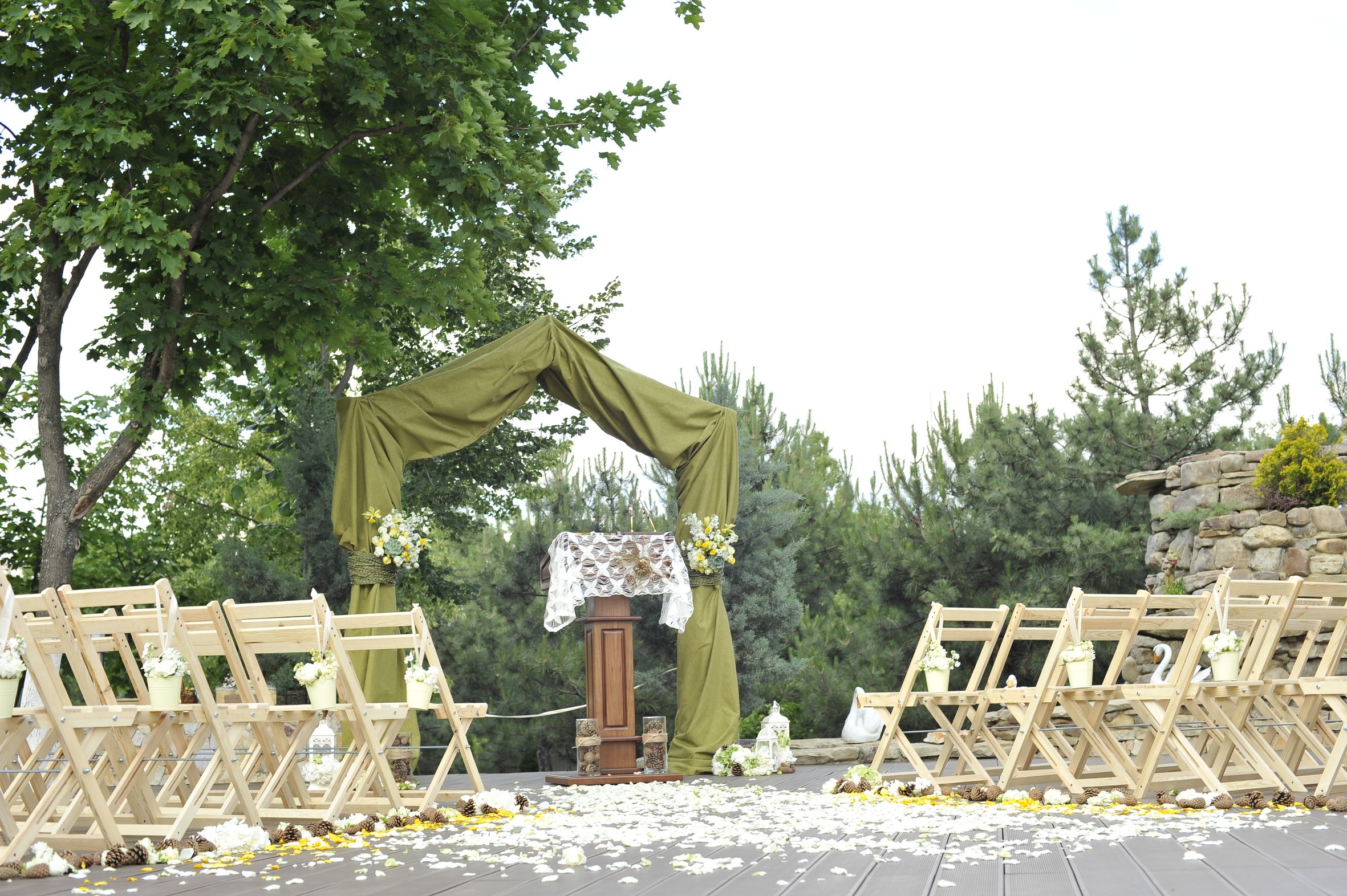 На самом деле мест для свадебного торжества гораздо больше, чем Вы думаете, всё зависит от Ваших предпочтений. Если Вы хотите свадьбу «как в кино» с выездной регистрацией и празднованием на открытом воздухе — это можно реализовать даже холодной осенью или зимой, главное нанять грамотную кейтеринг-службу и утеплить шатры, а летом всё ещё проще. Подобное торжество обходится дороже, так как нужно доставить гостей до места празднования, оплатить кейтеринг и шатры, но результат точно стоит того: свадьба будет именно такой, о какой Вы мечтали.