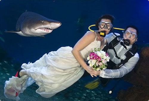 Итальянская пара выбрала свидетелями своей свадьбы 19 акул. С аквалангами и в свадебных костюмах влюбленные спустились в аквариум с хищными рыбами. В то время пока мэр города, стоявший у кромки воды, произносил необходимые слова для оформления брака, молодожены обменялись кольцами и поцеловались масками.