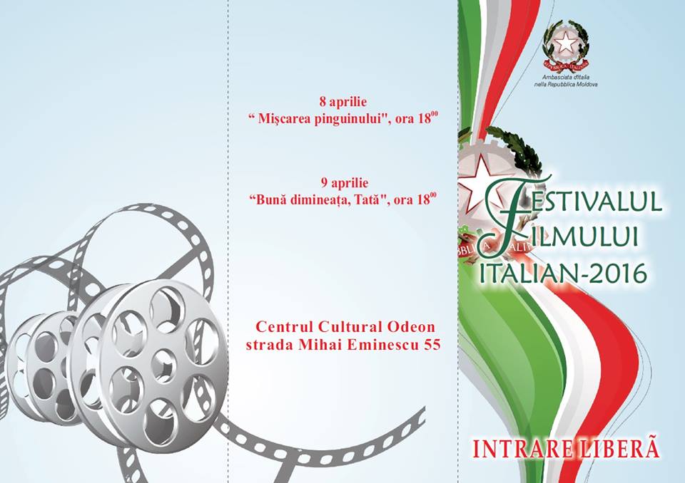 În perioada 8-9 aprilie, în incinta Cinematografului "Odeon" va avea loc ediția 2016 a Festivalului Filmului Italian. Pe 8 aprilie, cinefilii au avut ocazia de a viziona filmul "Mișcarea pinguinului", iar a doua zi, 9 aprilie, va fi rulat filmul "Bună dimineața, Tată!". Sunt așteptați toți doritorii, cu începere de la ora 18:00. Intrarea este liberă!