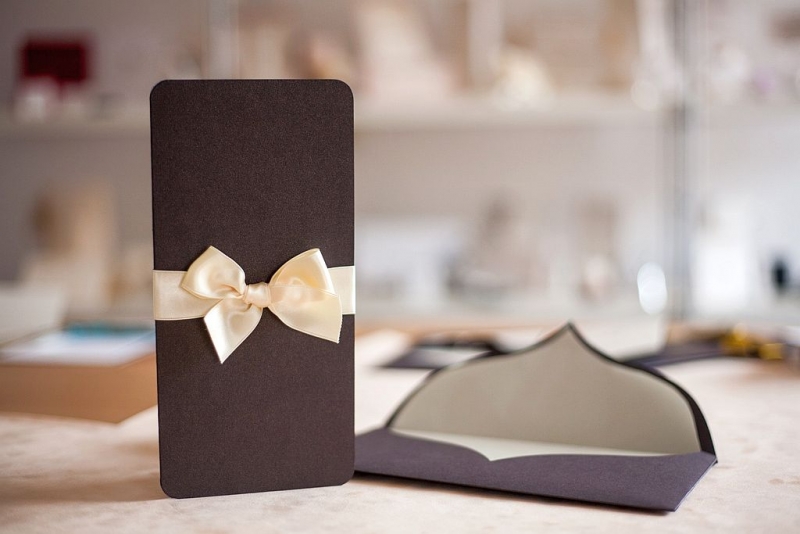 Этот необычный конверт легко сделать даже самой. Используй картонный лист, на который наклеивается пригласительный. Все это обворачивается аккуратном листом а-ля пояс с элегантным бантиком посредине.