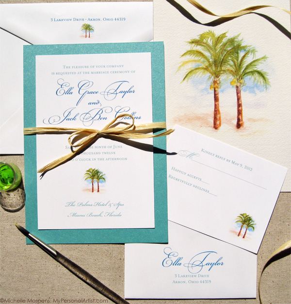 Что у тебя ассоциируется с пляжем больше всего? Конечно же, пальмы. Размести на своих пригласительных аккуратный рисунок двух пальм, которые будут символизировать двоих молодоженов. И не забудь о морской голубой окантовке!