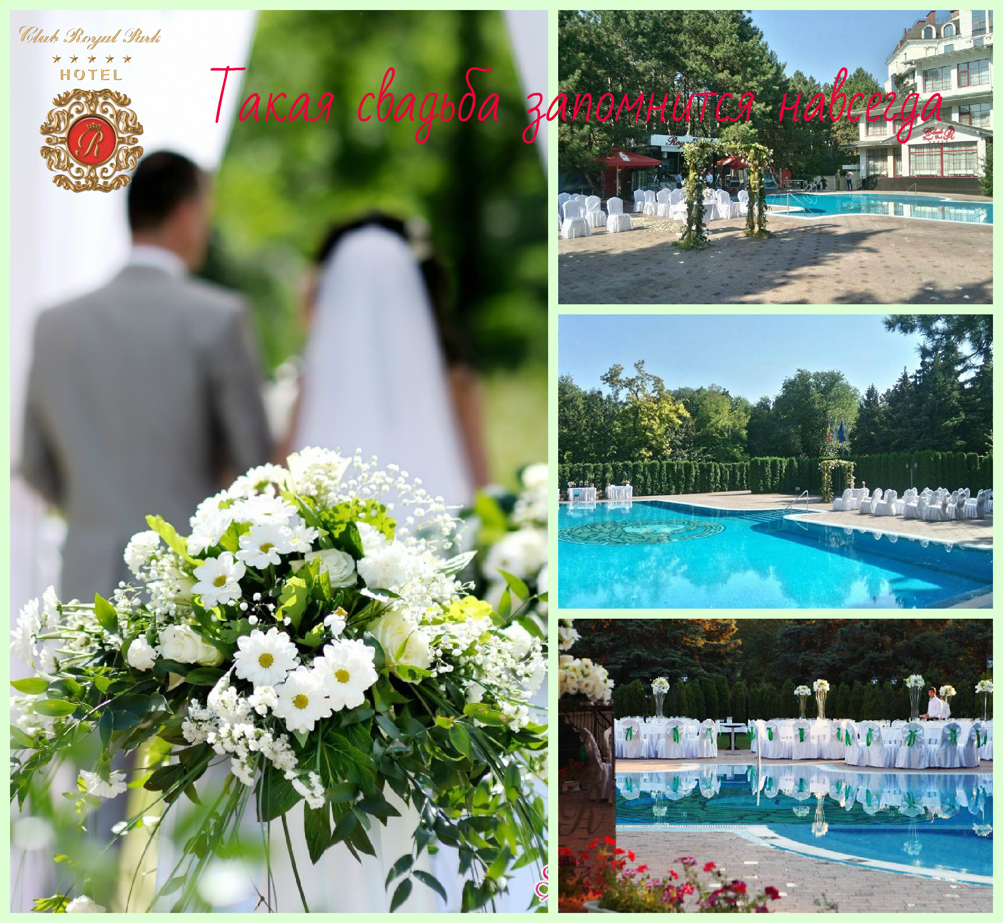 Свадьба у открытого бассейна "Royal Park" в окружении моря цветов, пения птиц, благоухания цветущих деревьев. Это торжество запомнится навсегда. Трогательная церемония бракосочетания непременно окажется одним из самых незабываемых моментов Вашего торжества. Доверьтесь профессиональным заботам сотрудников "Club Royal Park".