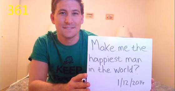 На протяжении года он каждый день снимал самого себя с листом в руке, на котором было написано: «Ты будешь моей женой?» В душе, на кухне, на улице, и даже у нее дома - это всего лишь несколько мест, где парень предлагал любимой выйти за него более 300 раз, а она даже ничего не заподозрила. Затем он создал забавный ролик, в котором смонтировал все, что снимал в течение года, а также кадры, где они вместе.