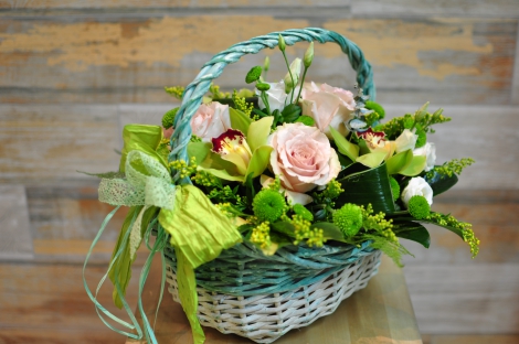 По желанию цветы могут быть заменены на Ваши любимые или любимые цветы получателя. Выберите цветовую гамму корзины розового или зелёного цвета.