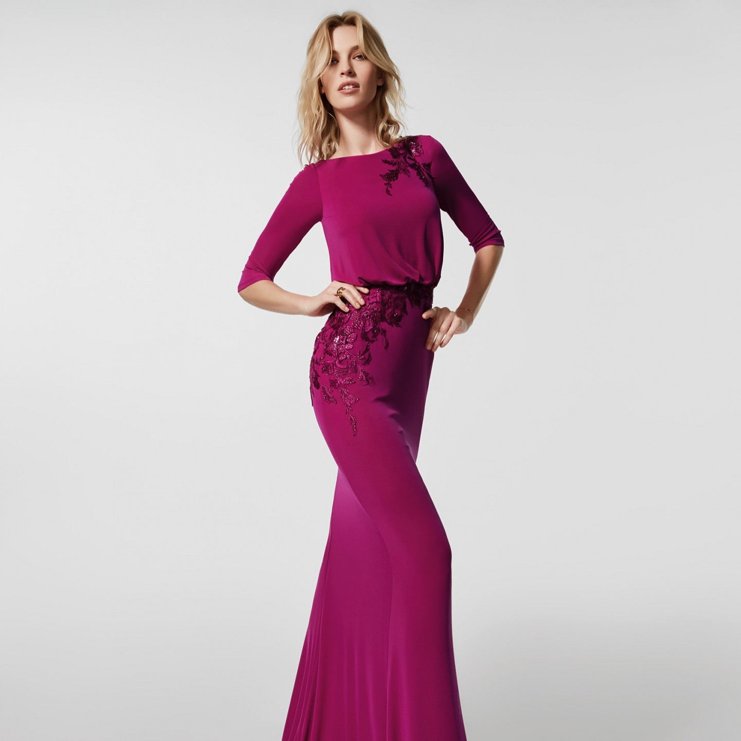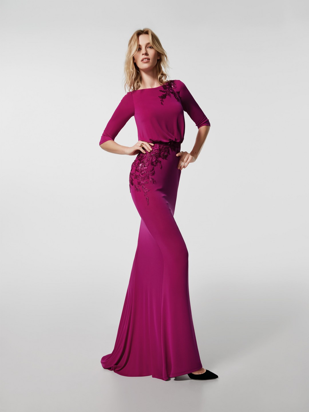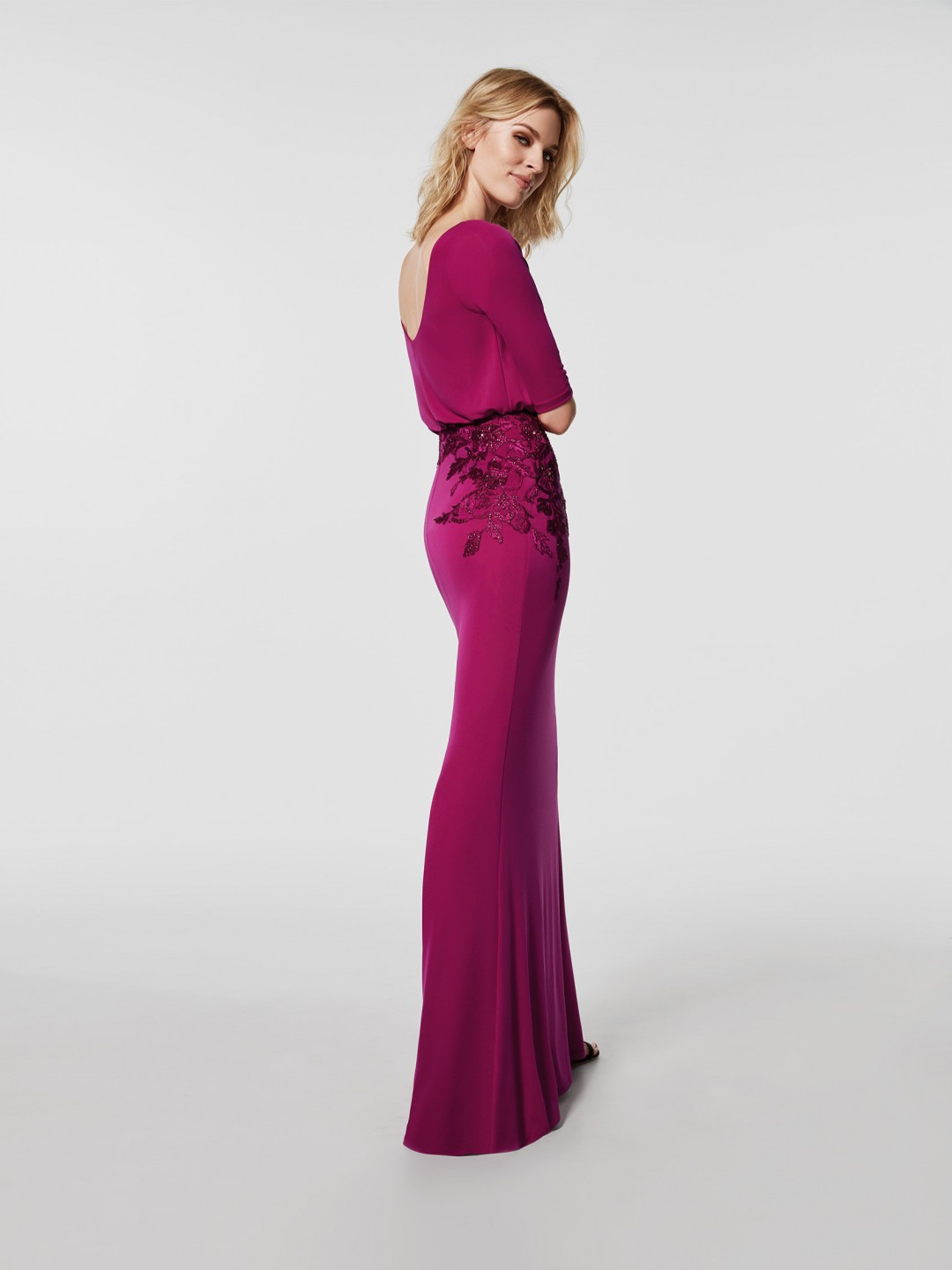 Само воплощение стиля в этом удивительном платье из трикотажа, которое обтягивает талию. Плавное коктейльное платье из двух частей, состоящее из юбки, украшенной аппликациями из драгоценных камней и вышитыми цветочными мотивами. Лиф имеет объем, вырез в форме бато, круглую спинку и рукава 3/4. Левое плечо украшено красивой цветочной вышивкой, соответствующей талии.